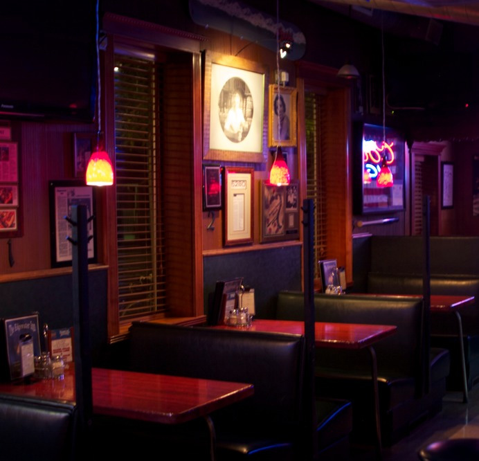 The restaurant/bar is one, in other words the restaurant tables surround the perimeter of the bar. The exception being the new covered patio addition, which is a bit different. The main dining/bar area has a number of very cozy booths nestled up against quality, rich woods. The only thing I’d change is the worn, grey veneer of the lower bar. Wood matching the window trim would complete the interior.